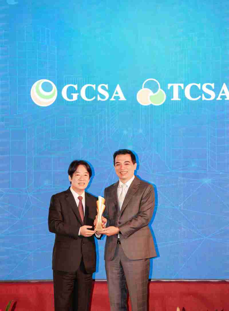 达全方位永续表现获全球永续奖及台湾永续奖肯定,,由副总统赖清德颁奖 (左),,,巨星国际总经理柯富仁 (右) 代表领奖