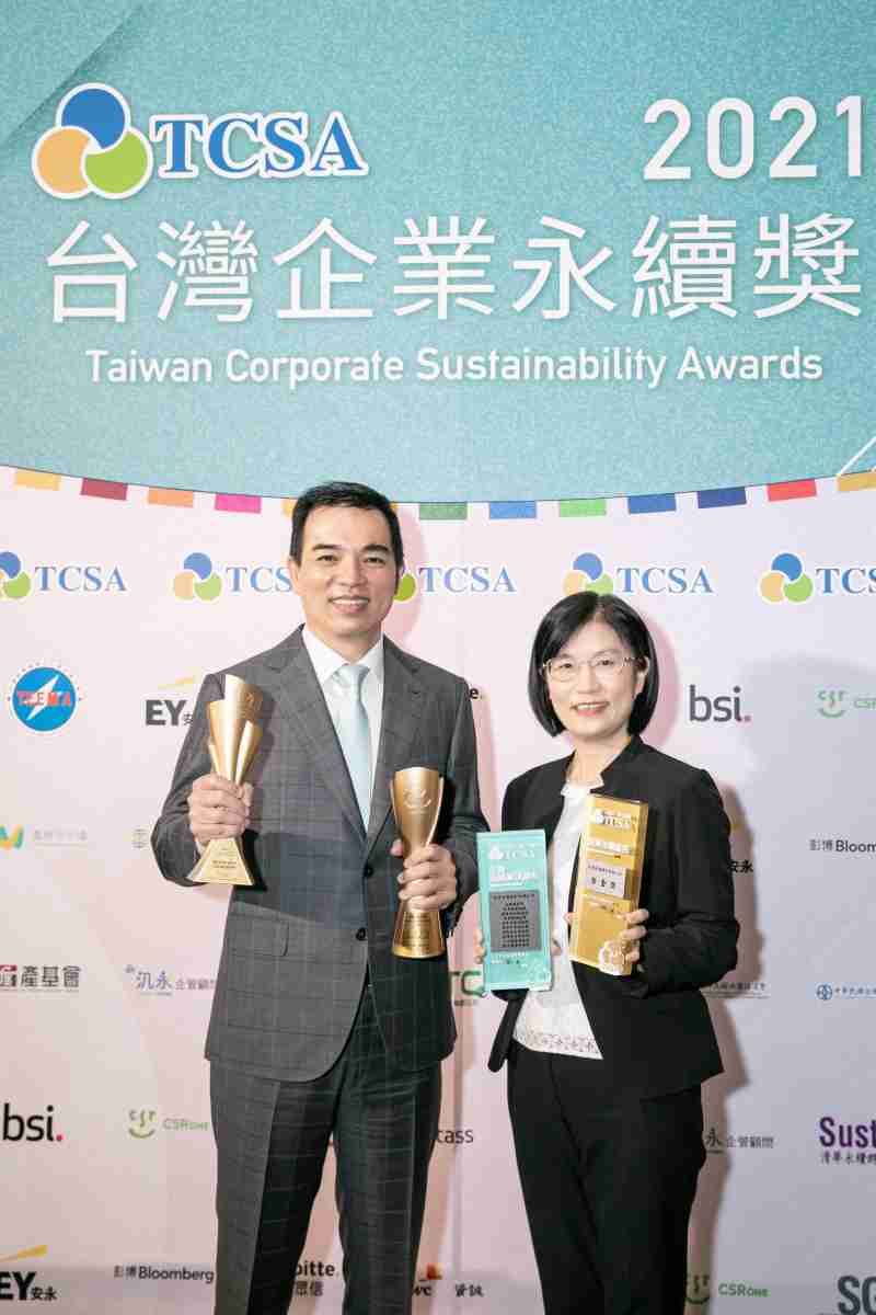 达在台湾永续奖所评比环境、、社会、、治理等各面向的永续绩效均获高度肯定 (左:巨星国际光电总经理暨营运长柯富仁,,右:巨星国际光电永续长古秀华)