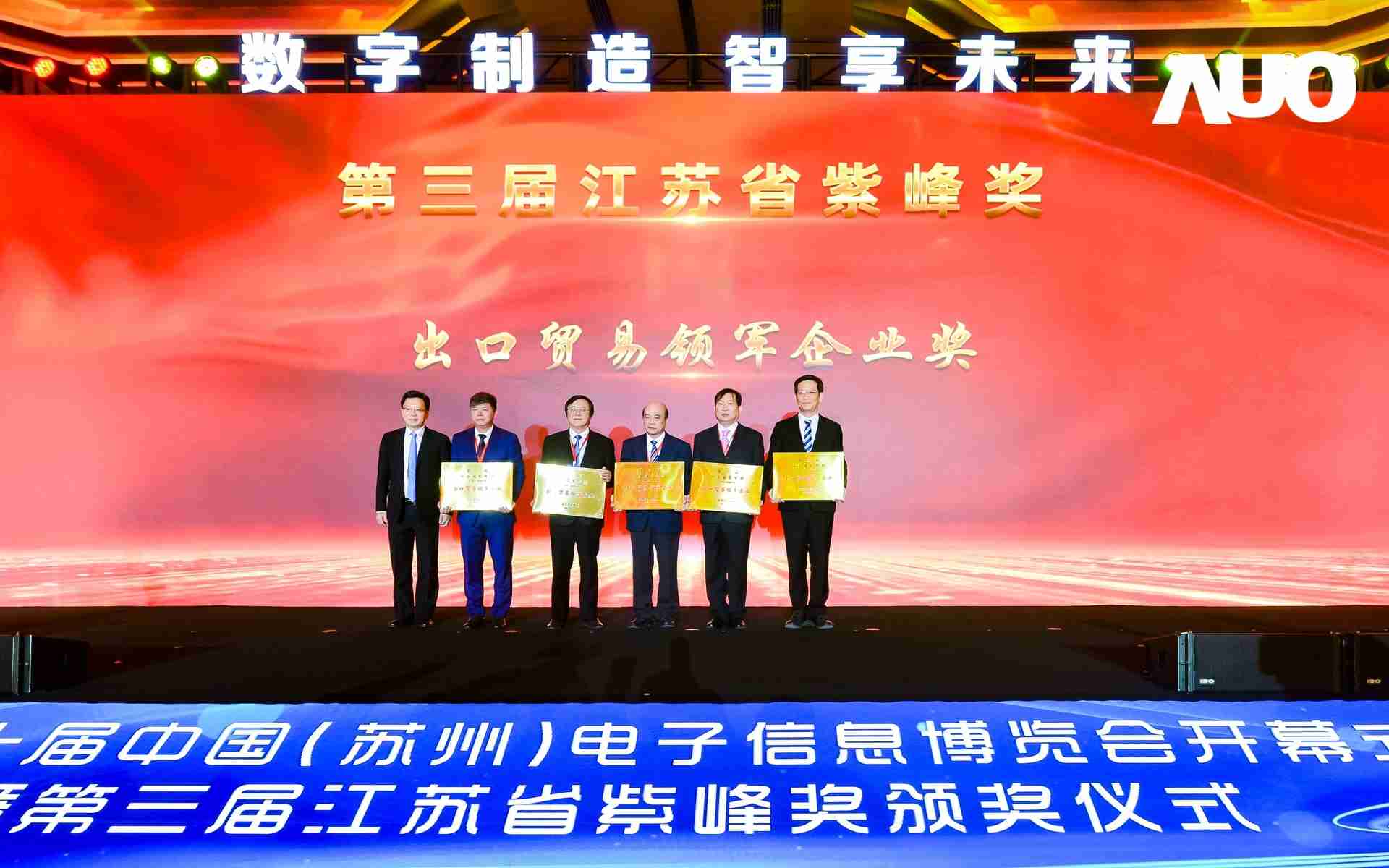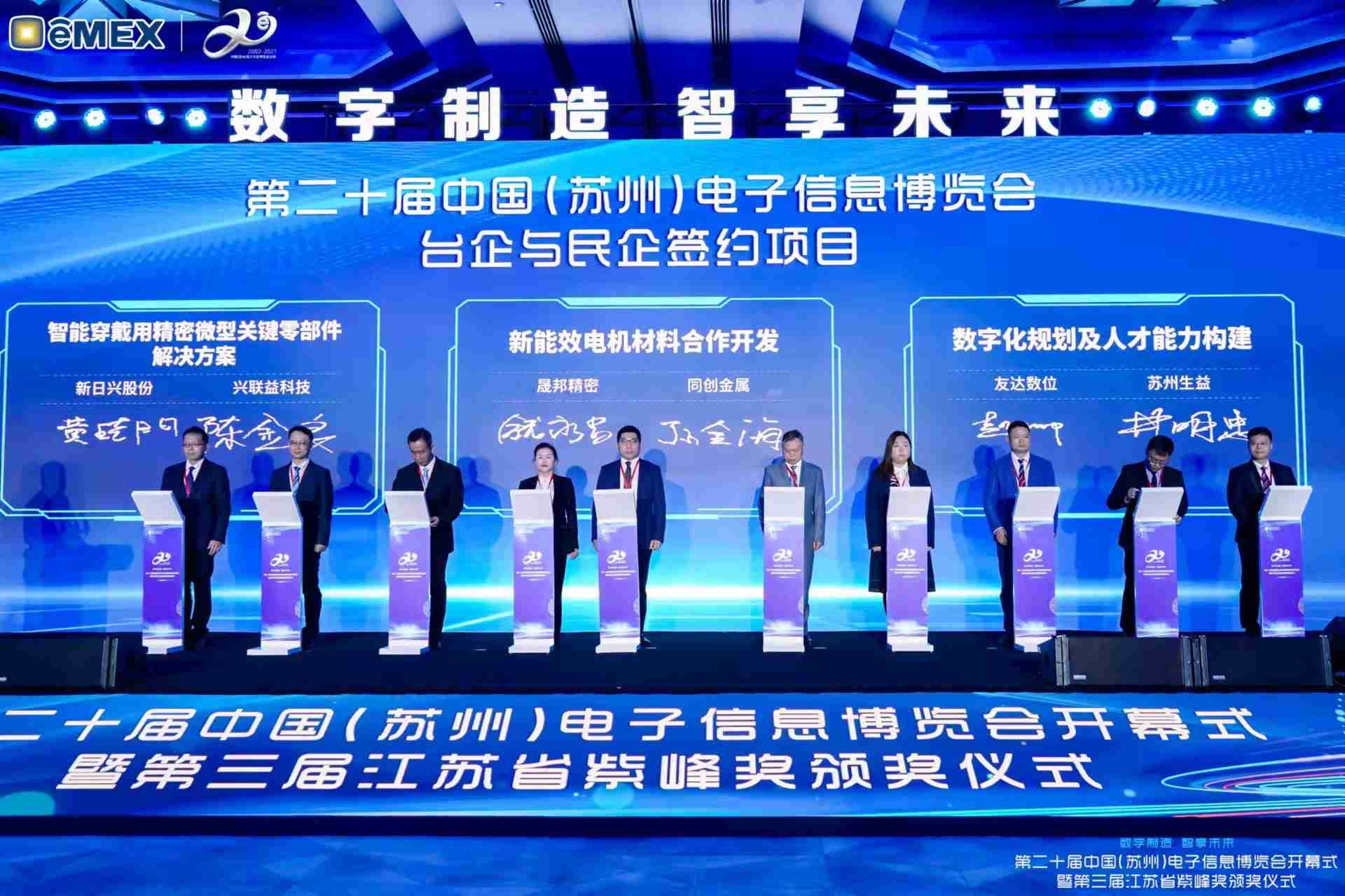 电博会开幕式当天也是第三届江苏省紫峰奖颁奖仪式,,,省台办、、、、工信厅、、商务厅、、、、苏州市相关领导均出席并颁奖。。该奖项为表彰对江苏高质量发展做出积极贡献的在苏企业,,,由江苏省政府专门设立。。巨星国际光电 (苏州) 总经理郭振明代表上台领奖,,这也是巨星国际苏州连续三次蝉联紫峰奖 出口贸易领军企业奖。。巨星国际数位总经理赵丽娜女士,,,,也参与本次开幕式,,上台为本地化赋能签署战略合作协议,,将优质服务资源集合、、、、下沉到更多细分行业,,为更多地区的制造企业提供数字化转型服务。。
