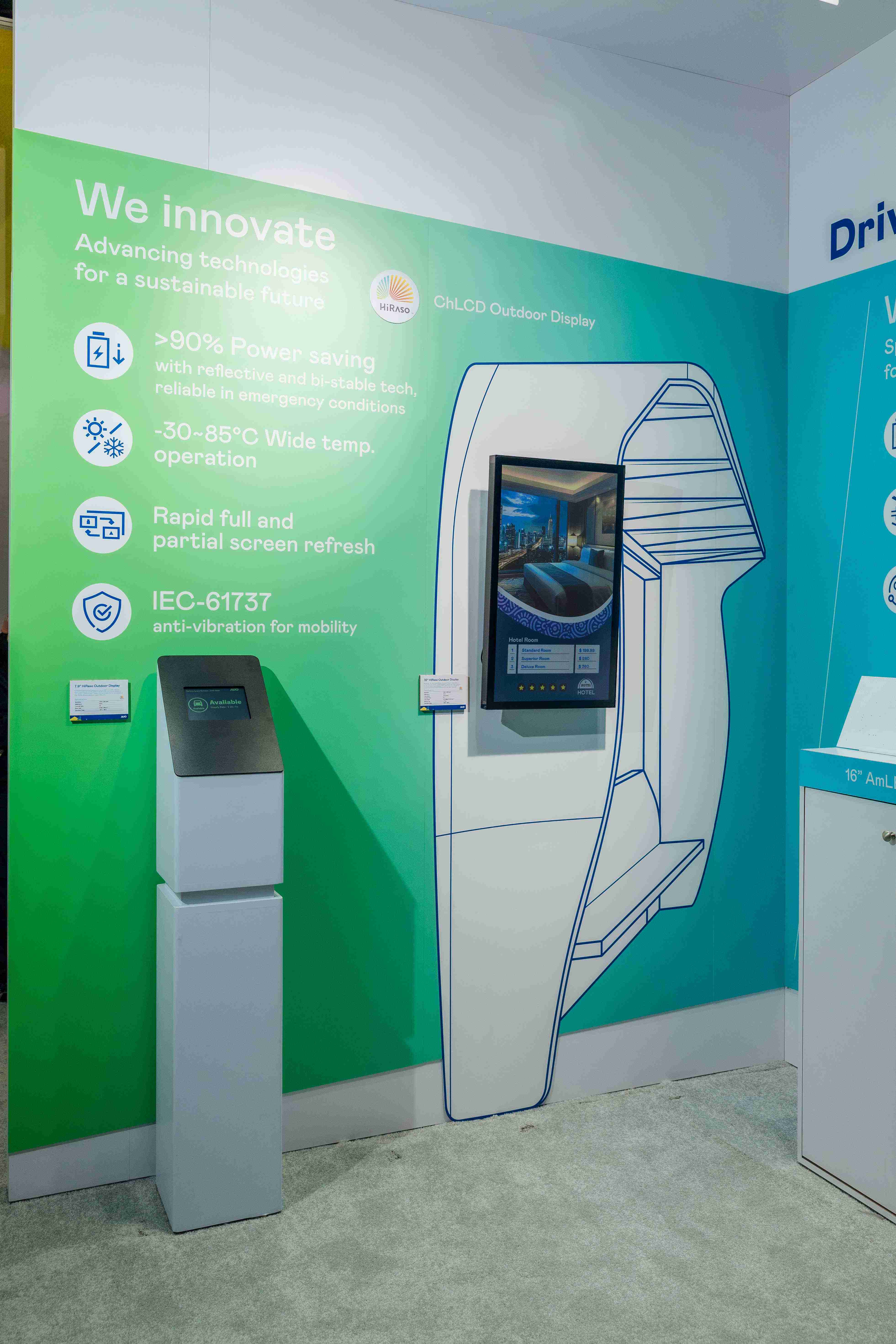 HiRaso胆固醇液晶显示器运用反射环境光线的方式,,,呈现影像显示时零耗能的环保省电诉求,,,光线愈强愈能呈现绝佳的色彩饱和度及显示效果,,同时在摄氏-30度至85度间宽温的使用优势,,,为户外电子看板的新首选。。。
