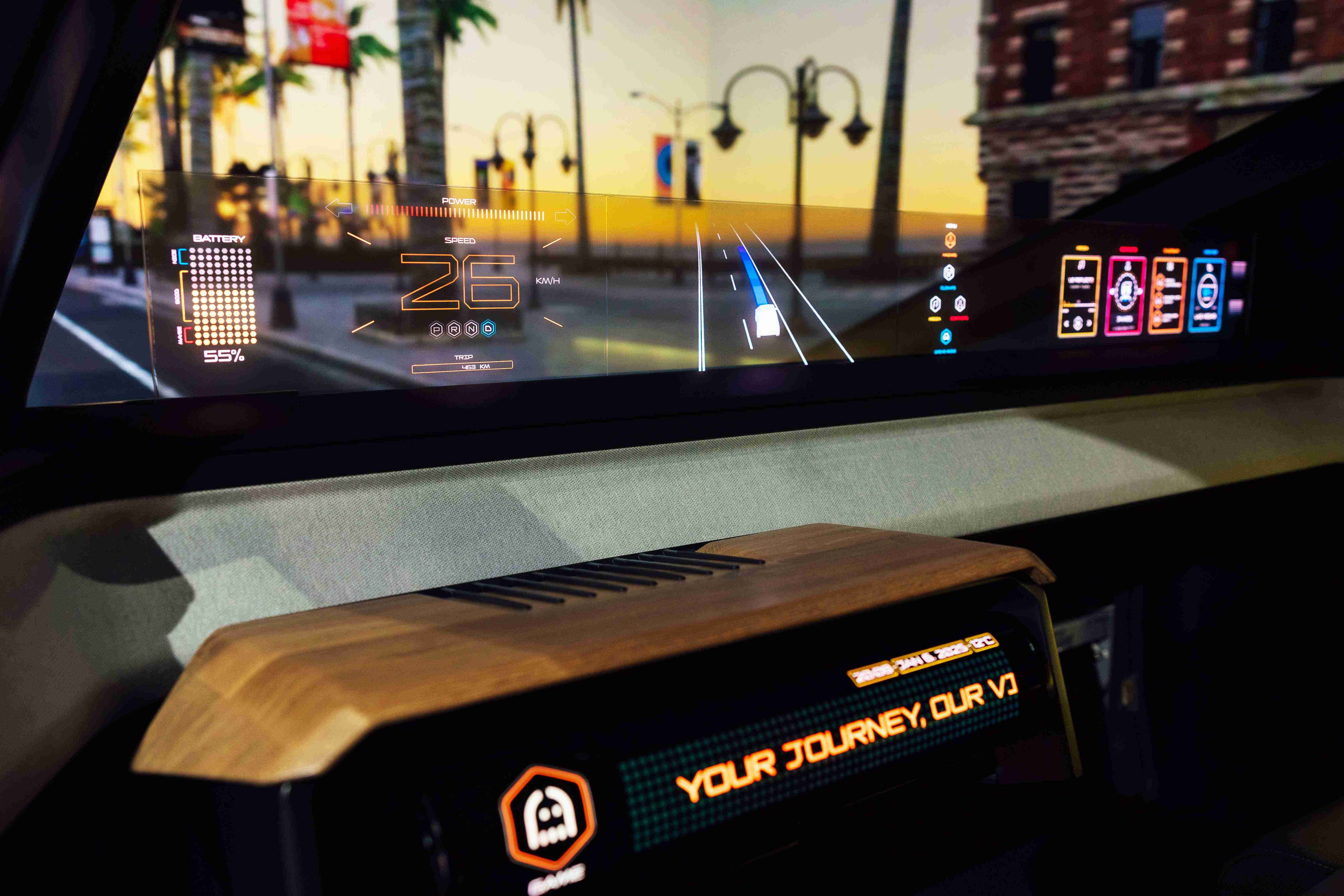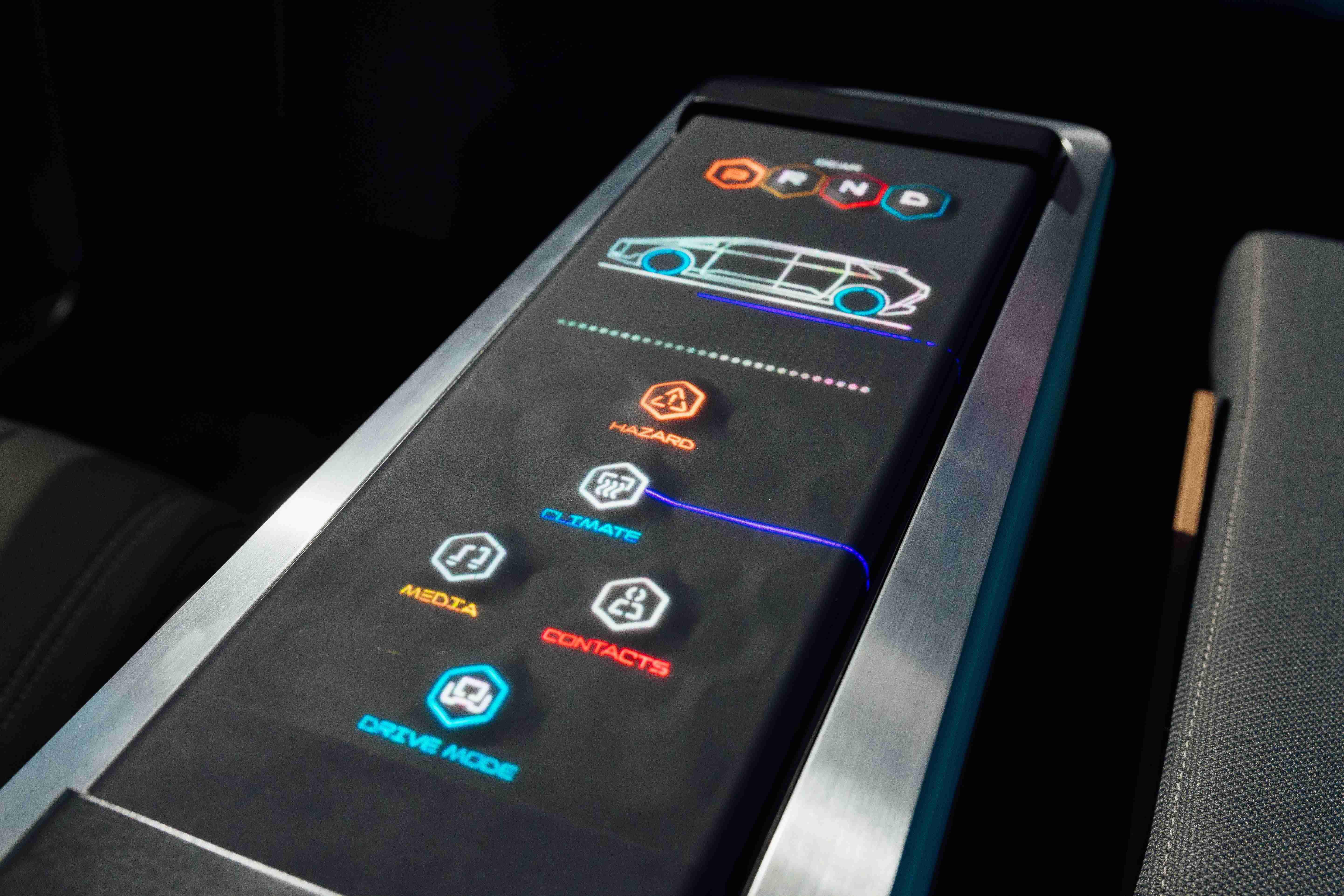 幻境全景天幕(Virtual Sky Canopy)将无缝拼接大型化的透明Micro LED显示器融入至天窗,,,带来沉浸式体验,,,将人机介面扩展至整个座舱。。 巨星国际光电以人性化的设计引领直觉式的人机互动,,,透过多变形态中控显示(Morphing Center Control)、、隐藏式智驾介面(Foldable Cruise Pilot)等解决方案,,让乘用者依据自身需求调整、、、控制座舱内所需功能。。。。