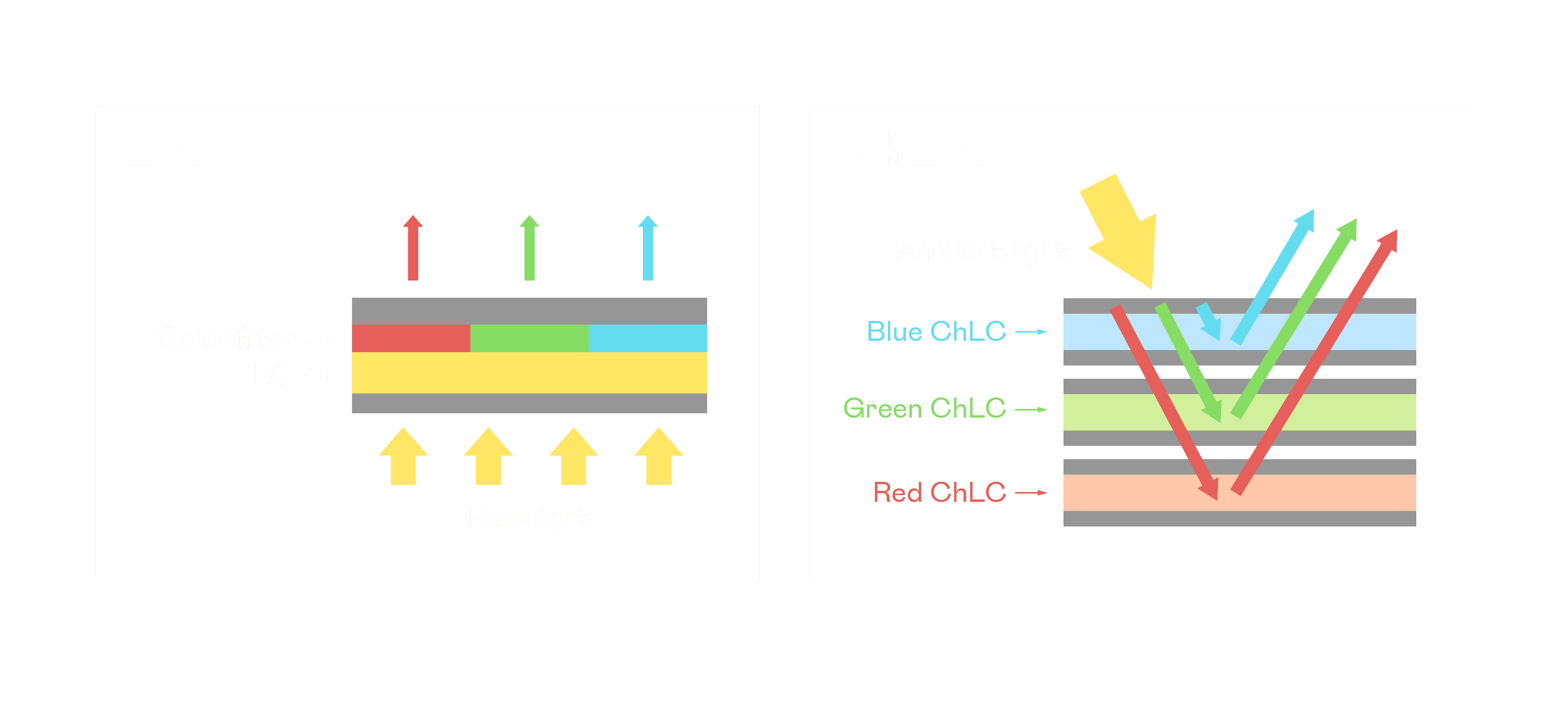 ChLCD 胆固醇液晶就如同纸张一样,,,透过反射环境光来显示影像,,,因此长时间观看不易造成人眼视觉疲劳,,,可达到护眼效果。。。当处于户外阳光下使用,,,,LCD 影像容易失真而不易观看,,,,但胆固醇液晶仍可维持较佳的影像品质。。