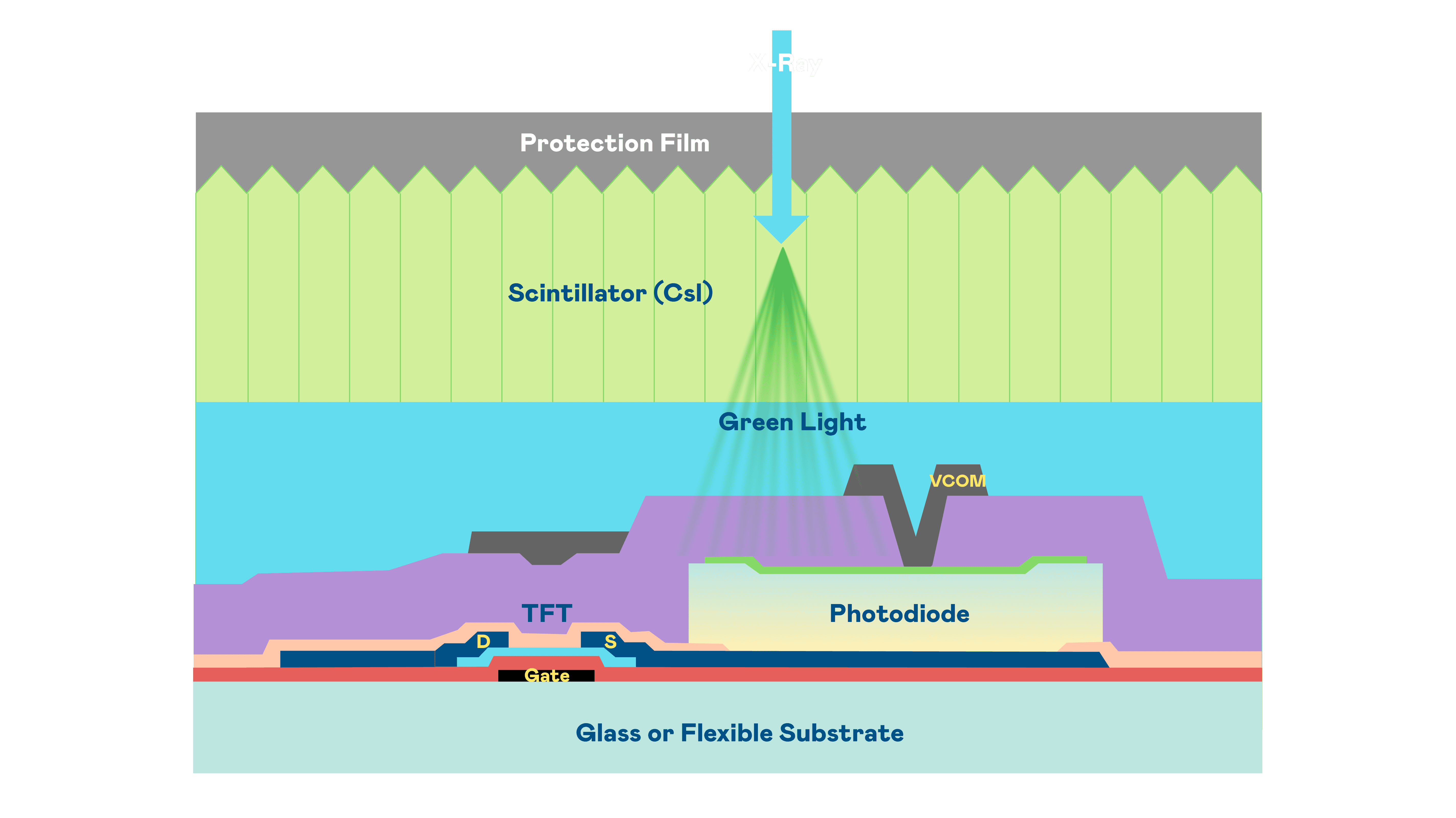 巨星国际的X光影像感测阵列使用薄膜电晶体 (TFT) 作为每个像素的读取开关,,,搭配光电二极体(Photodiode)的光电转换元件,,,,用以感测X光影像讯号。。